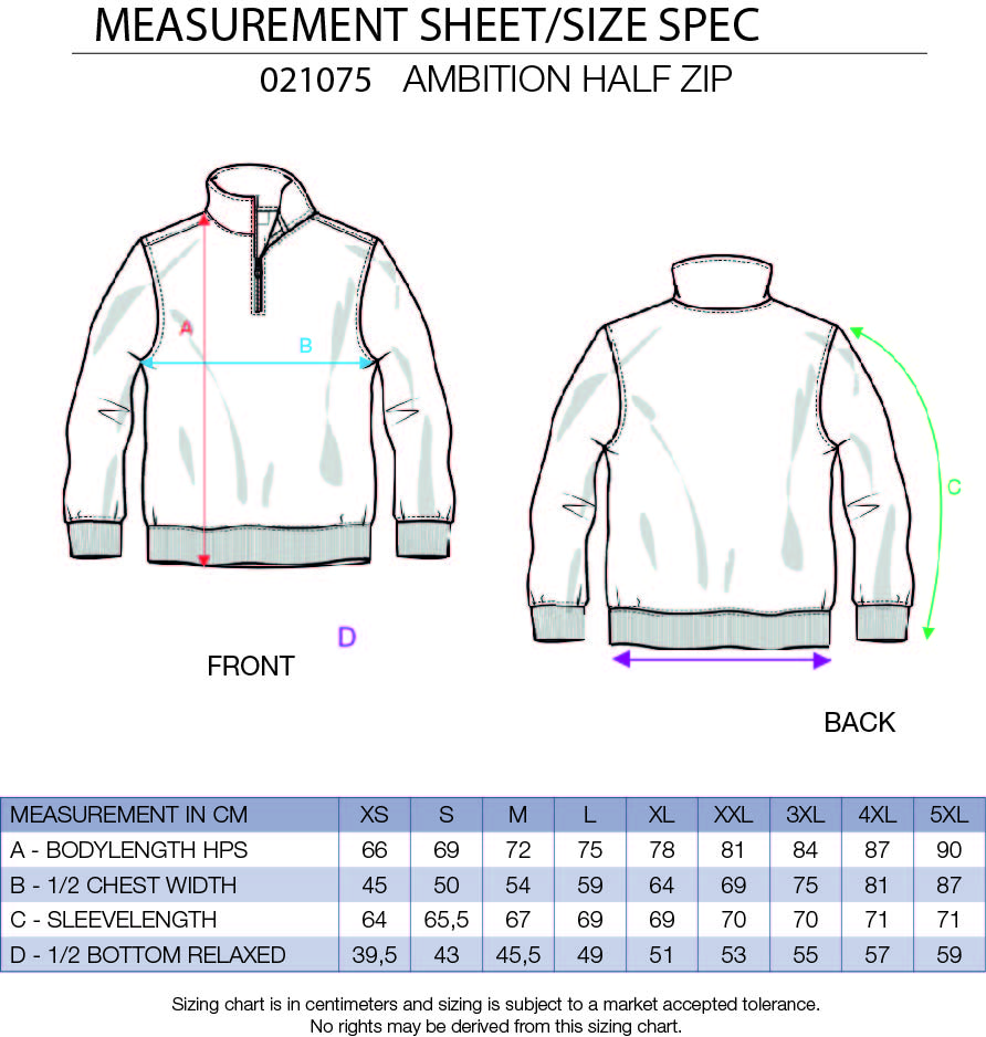 - De Ambition Half Zip is een unisex trui met halve rits en contrasterende panelen voor betere zichtbaarheid.